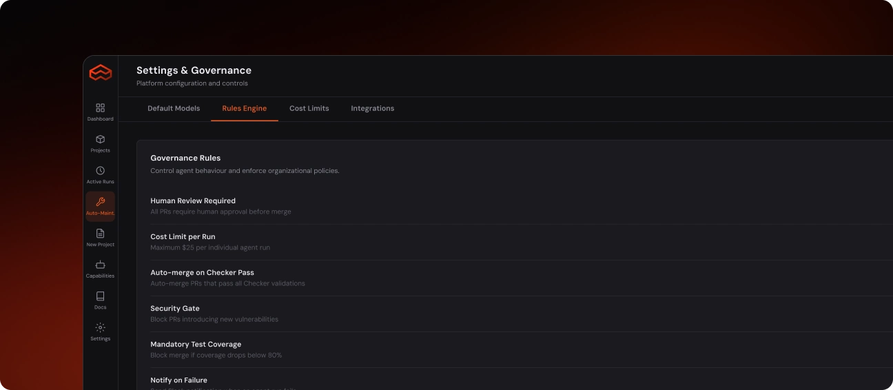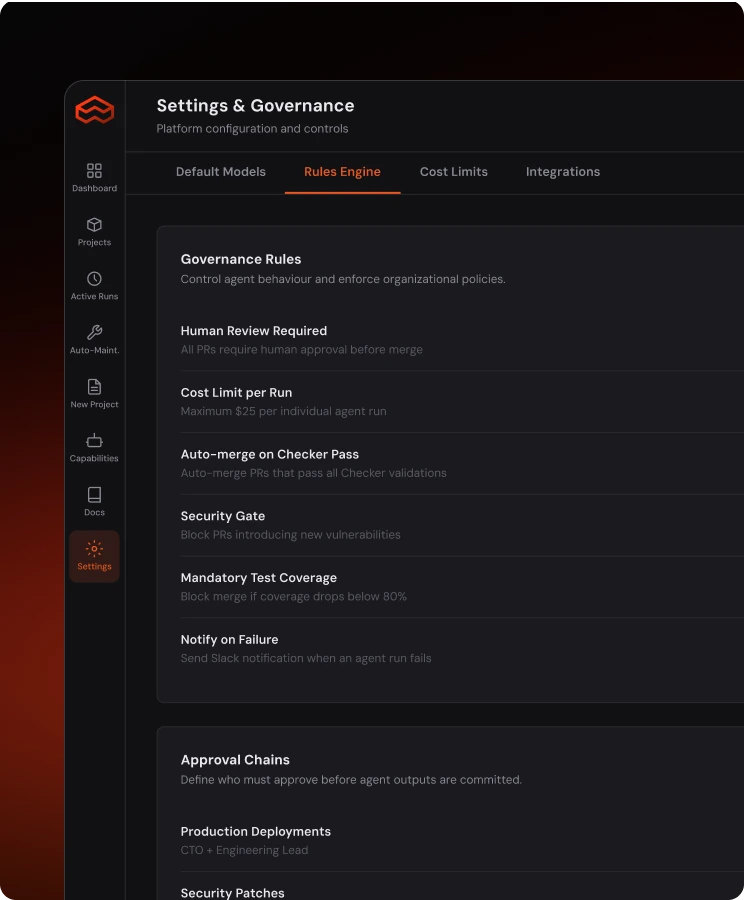 AppFactor includes a command centre built for engineering leaders. See every project, track spend, monitor agent performance, and control exactly what the platform can do and where it’s assigned to perform objectives - which repositories it touches, which environments it deploys to, and which models power each task.