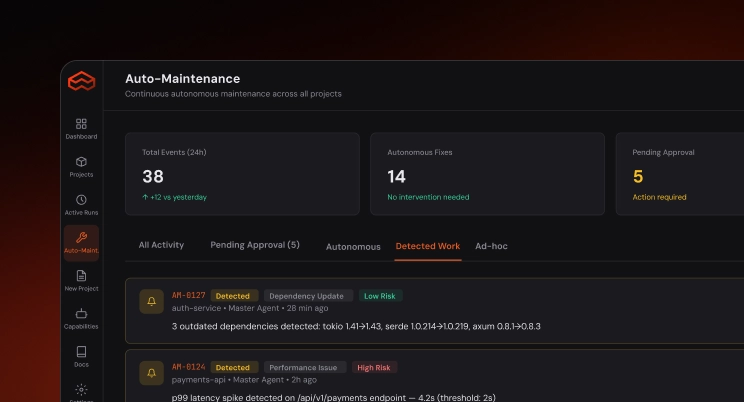 The same platform that handles your maintenance backlog also executes your most ambitious modernization projects. Migrate codebases. Rewrite to Rust. Refactor monoliths. Containerize and deploy to cloud-native runtimes. AppFactor's orchestration layer coordinates multiple specialized agents across complex, multi-step transformations.