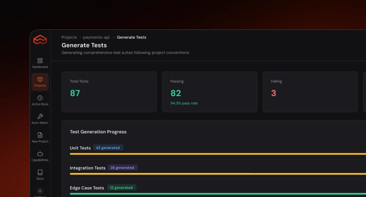 Close coverage gaps automatically. Generate unit, integration, and regression tests grounded in your actual codebase and runtime behaviour.